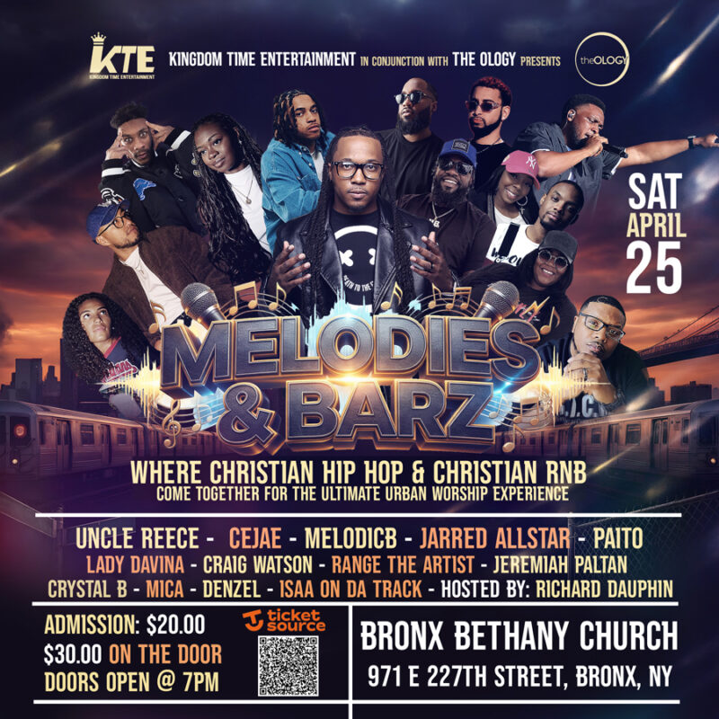 Kingdom Time ENT, in collaboration with The Ology, proudly presents MELODIES & BARZ — where Christian Hip Hop and R&B collide for an unforgettable urban worship experience.